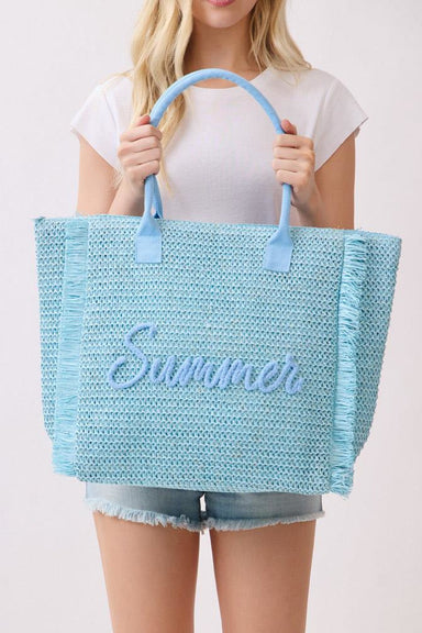 braided straw tote bag fringe and metallic thread details tonal "Summer" word design lined with interior pocket zip closure 19" x 14 x 5"