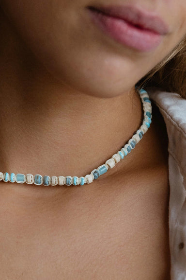 Crafted with stunning pearly troca shell beads and natural blue-tone stone chips, this bracelet brings to mind the shimmering shores and majestic p...