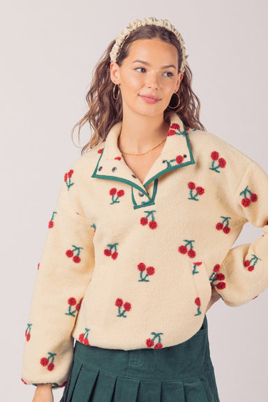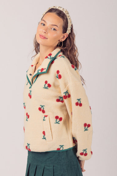 Cozy up in something a little more fun this winter! The Sweet Cherry Fleece features an all-over cherry print, and oversized fit, and drawstring ad...