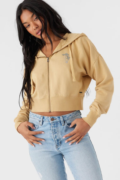 Comfy cozy zip-up hoodie that has a soft cotton/fleece design, solid color wash and front graphic detail. Women's zip-up hoodie 27 3/8" In length ...