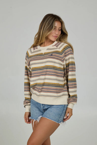 80% Cotton / 20% Polyester Y/D Terry Stripe crew neck pullover Inset V-neck detail at collar Embroidery at front chest