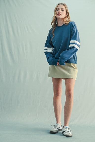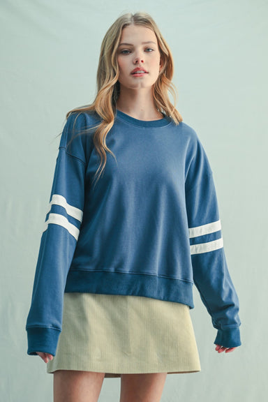 The Keep Score Pullover is a varsity inspired sweatshirt. It features a slightly oversized fit, drop shoulders, and striped detail on sleeves. 80% ...