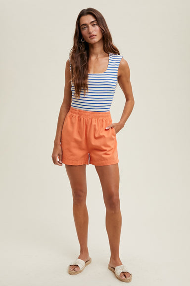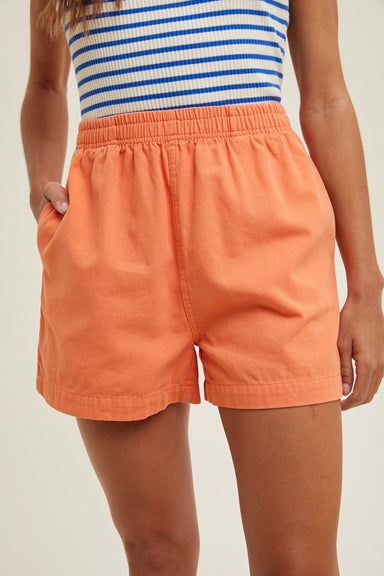 The Gym Class Shorts are pull on, elastic waist shorts with side seam pockets and a back pocket. 100% Cotton