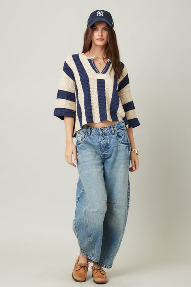 The Bateau Sweater is a boat neck cropped sweater featuring oversized stripes and a nautical feel. 42% Acrylic 30% Polyester 28% Polymide