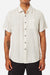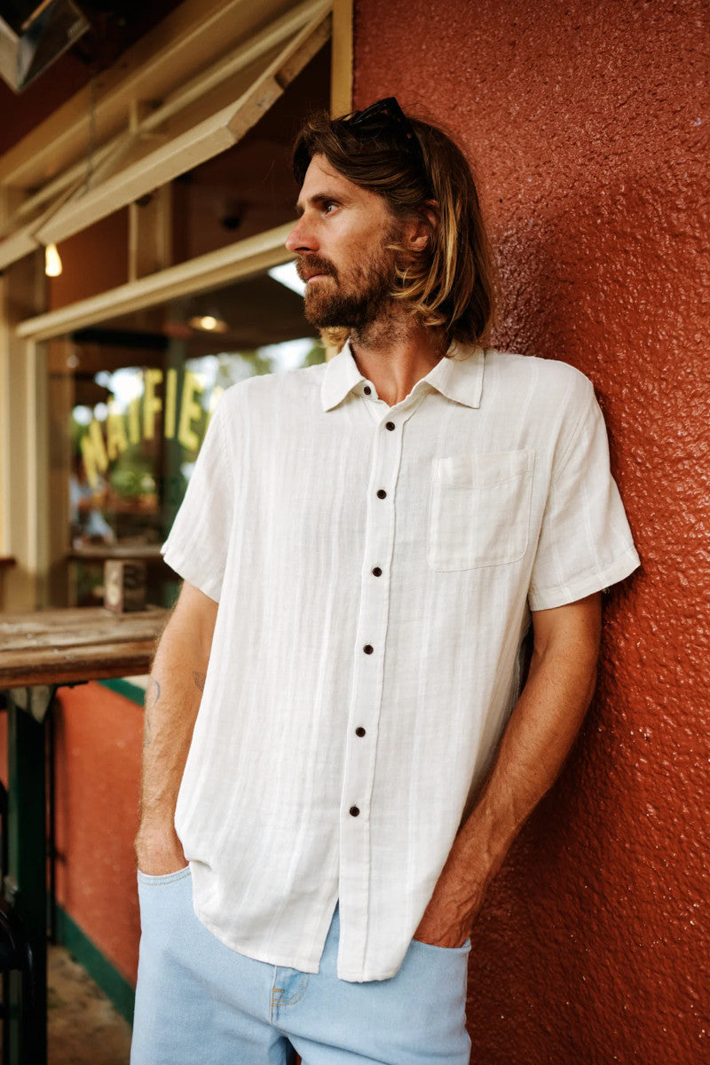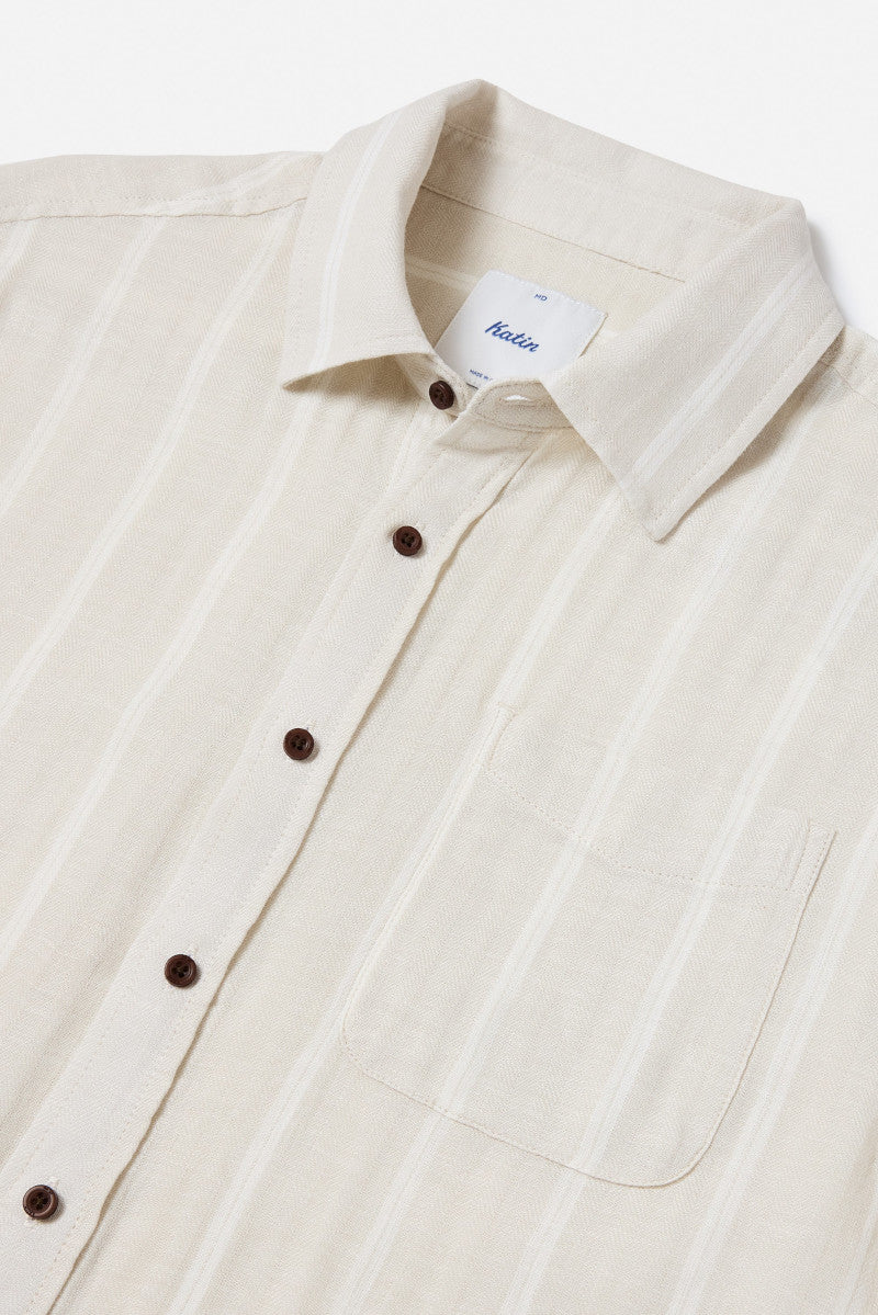 The Alan Shirt features a custom vintage-inspired stripe woven into a herringbone cotton/linen button-up shirt.