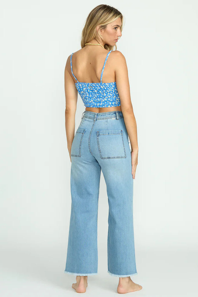 The Free Fall Jeans pairs a waist-accentuating high rise with a cool, wide leg. Made with blended cotton, the Essentials collection pant is fitted and flattering through the hips, with button-fly closure, a raw hem, and just enough stretch to keep them all-day comfy.
