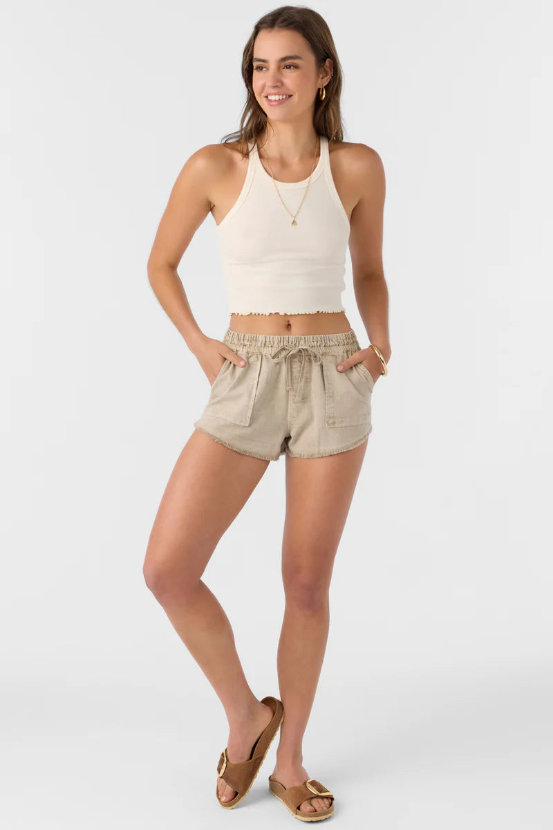 Casual woven short that has a lightweight cotton twill fabric design, solid color wash, raw edge hem detail.